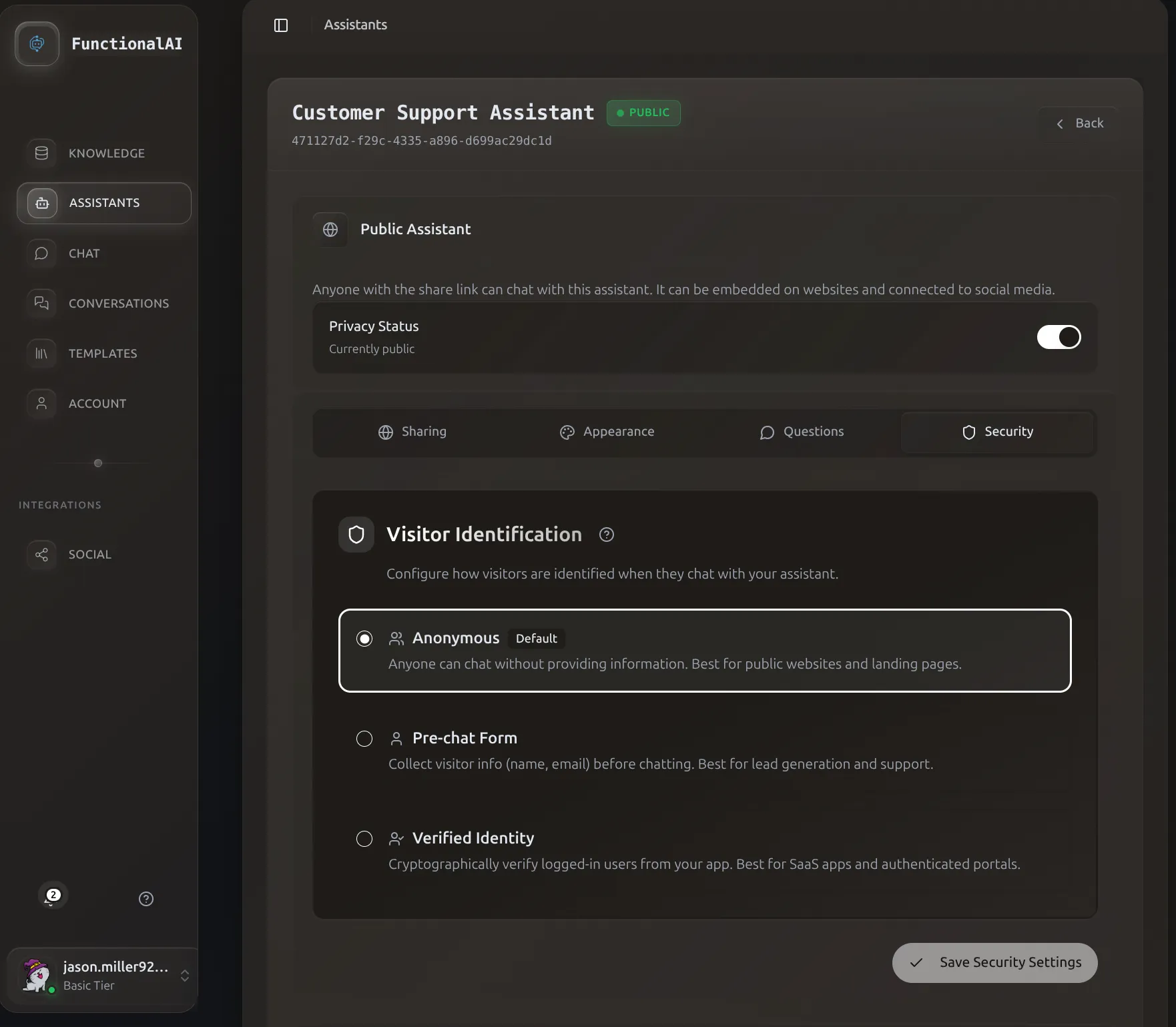 Security settings control how users identify themselves before chatting with your assistant. Choose the right level based on your needs: