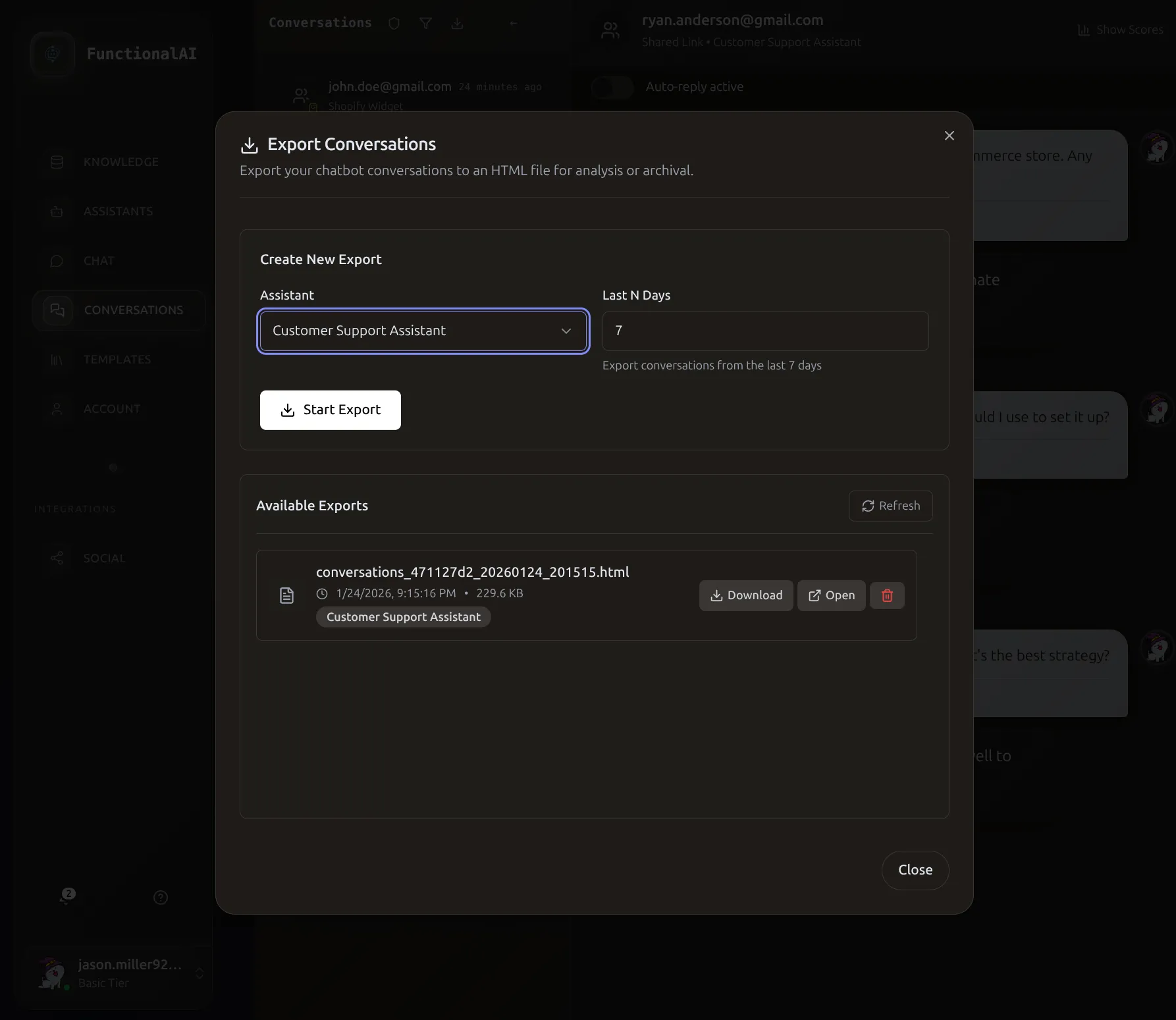 The Export dialog lets you select an assistant and time range, then download HTML archives of conversations.